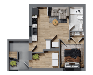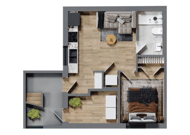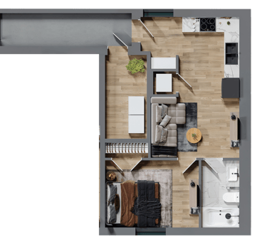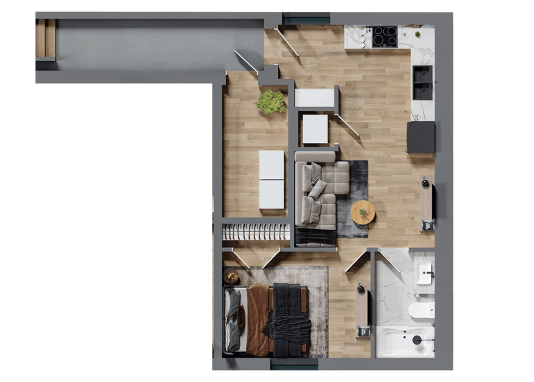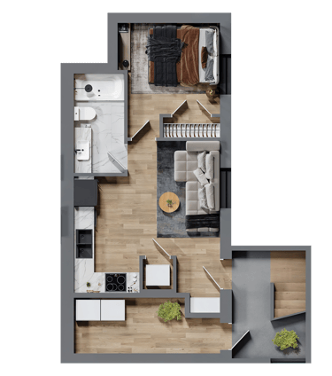 Ideal for individuals or couples, offering an open living space, a fully equipped kitchen, a comfortable bedroom, and a full bathroom, all designed for efficient and stylish living.