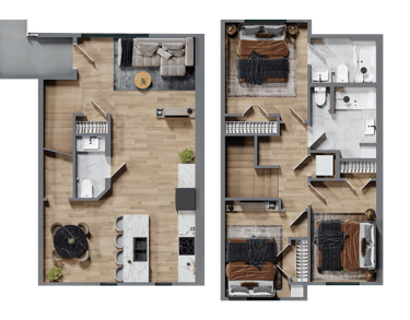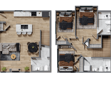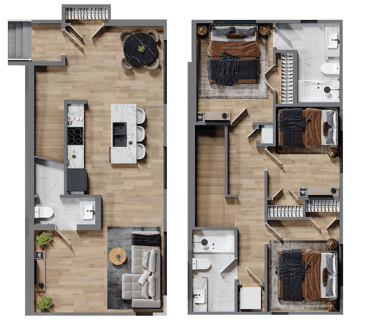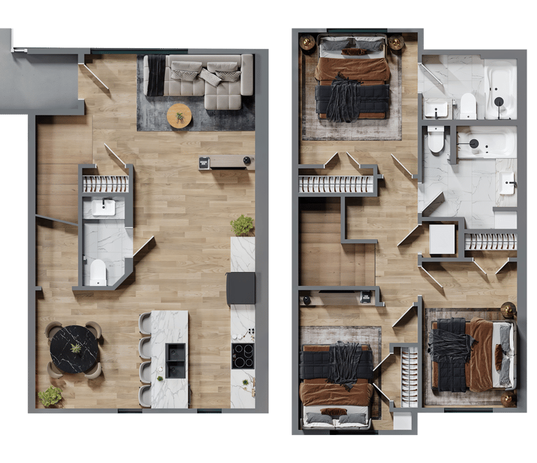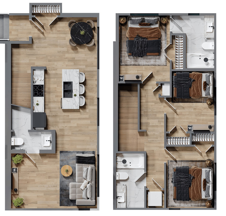 Step into a world of style and comfort with our open-concept living areas, featuring expansive kitchens equipped with quartz countertops, an island breakfast bar for casual dining, and designer lighting that sets the perfect ambiance. Large windows flood the space with natural light, creating a warm and inviting atmosphere.