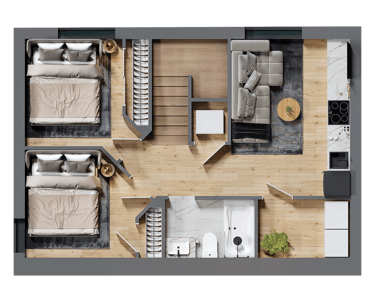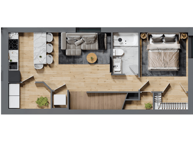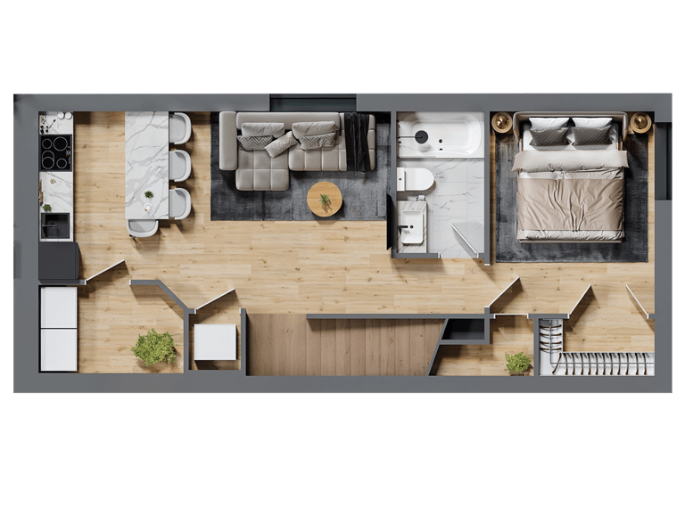 Our basement studios are Ideal for individuals or couples, offering an open living space, a fully equipped kitchen, a comfortable bedroom, and a full bathroom, all designed for efficient and stylish living. All with private entries.