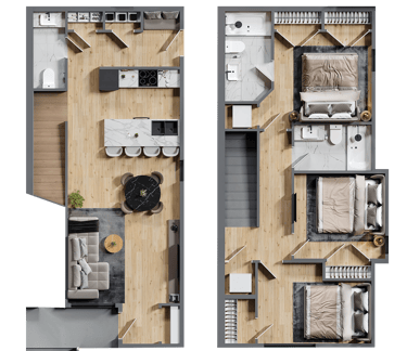 With soaring 9' ceilings throughout, our spacious 1, 2, and 3-bedroom floor plans offer a sense of luxury and openness. Select 3-bedroom units feature a private yard and direct access to a single garage—perfect for added convenience and outdoor enjoyment.