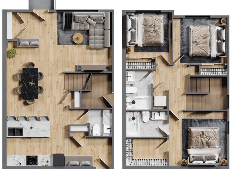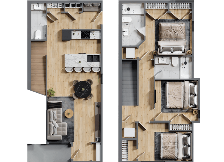 Designed for larger families or those requiring extra space, these floor plans includes expansive living areas, a gourmet kitchen, 3 bedrooms with a master suite, and comprehensive amenities for sophisticated living including a Single Garage. Select 3 Bedrooms feature a Private Yard Space.